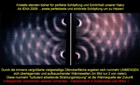 could actually produce such new magic, as this heat represents a particularly healthier heating than it has ever been possible with oil. This may also work with artificial crystal-inserts (producer not found yet) like with natural ones, which after all stand for the perfection of our creation. We intent to implement this patent on a world-wide scale in a fast and versatile way.